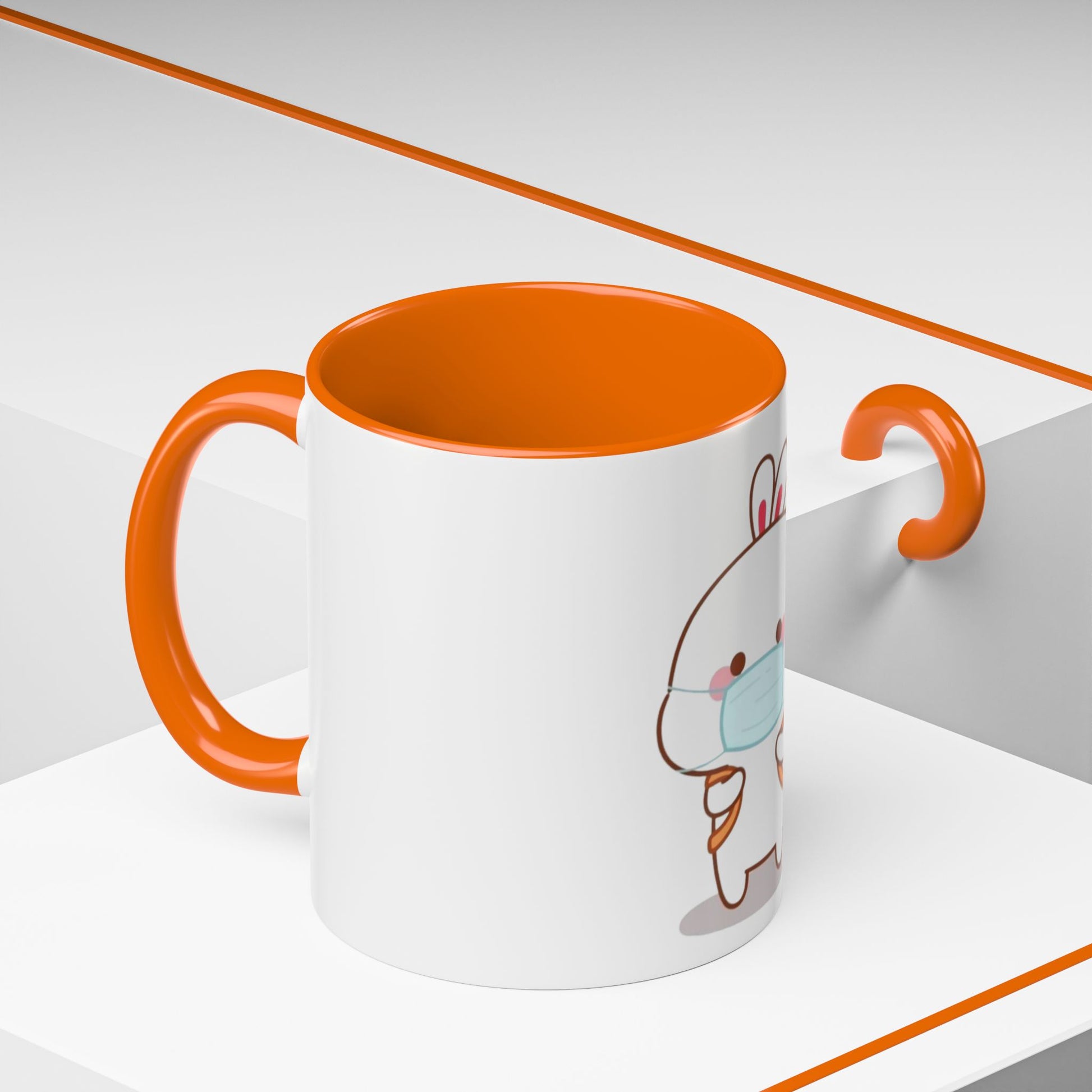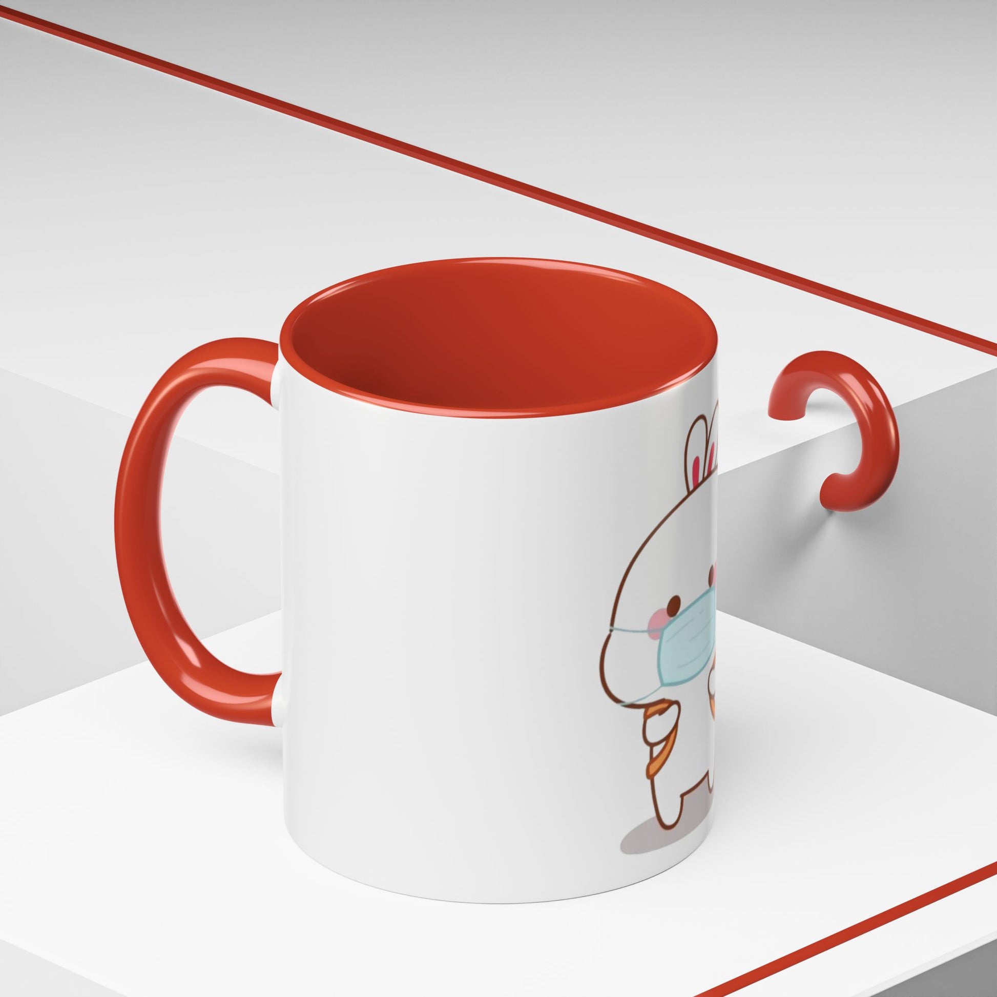 On its glossy white surface, a charming little bunny appears wide-eyed and ready for the day, tiny mask on, carrot in hand. The colors are crisp and vibrant, like a cheerful illustration that refuses to fade. Paired with a colored interior and matching handle, the design adds a playful pop that instantly lifts your mood and your space.