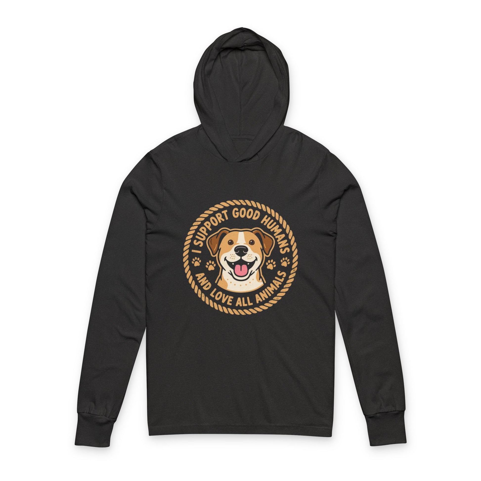 Celebrate kindness and comfort with this dog lover hoodie tee — a soft, lightweight long-sleeve shirt featuring a warm, playful dog emblem that reads “I Support Good Humans & Love All Animals.”