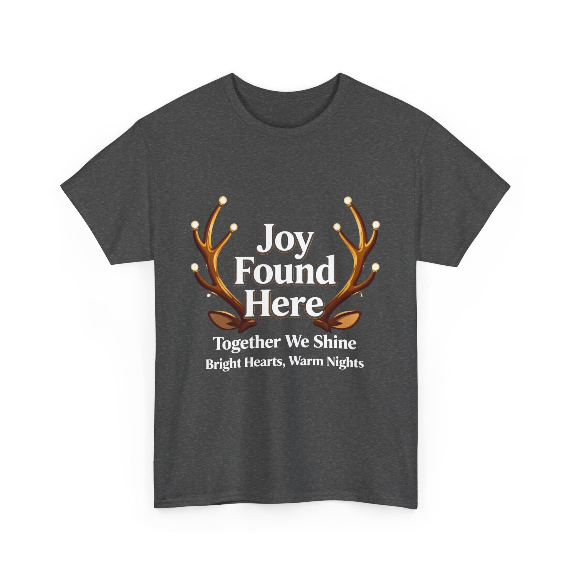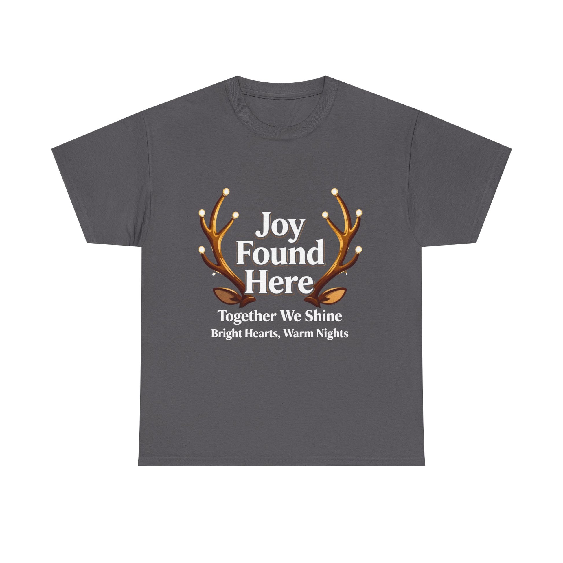 Crafted from medium-weight 100% cotton, it feels like a gentle hug - breathable, sturdy, and perfectly cozy for all your festive moments. The glowing antler artwork surrounds the words “Joy Found Here” in a design that feels both playful and meaningful, while “Together We Shine - Bright Hearts, Warm Nights” whispers like a shared secret between friends.