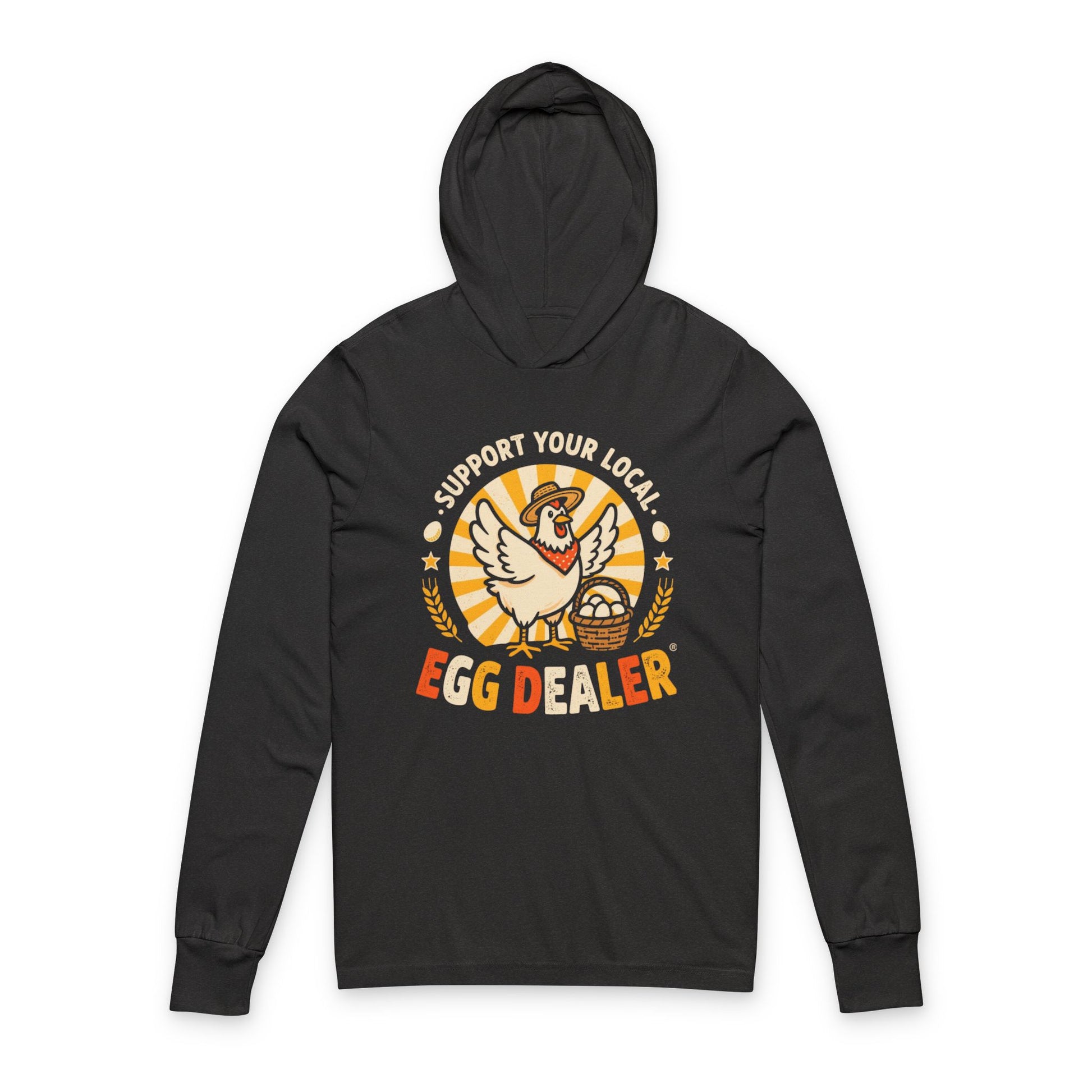This lightweight hooded long-sleeve tee brings cozy comfort together with a funny, vintage chicken design. Featuring the bold “Support Your Local Egg Dealer” graphic — a proud hen with warm eggs and sunny wheat tones — it adds a playful, retro touch to your everyday look.