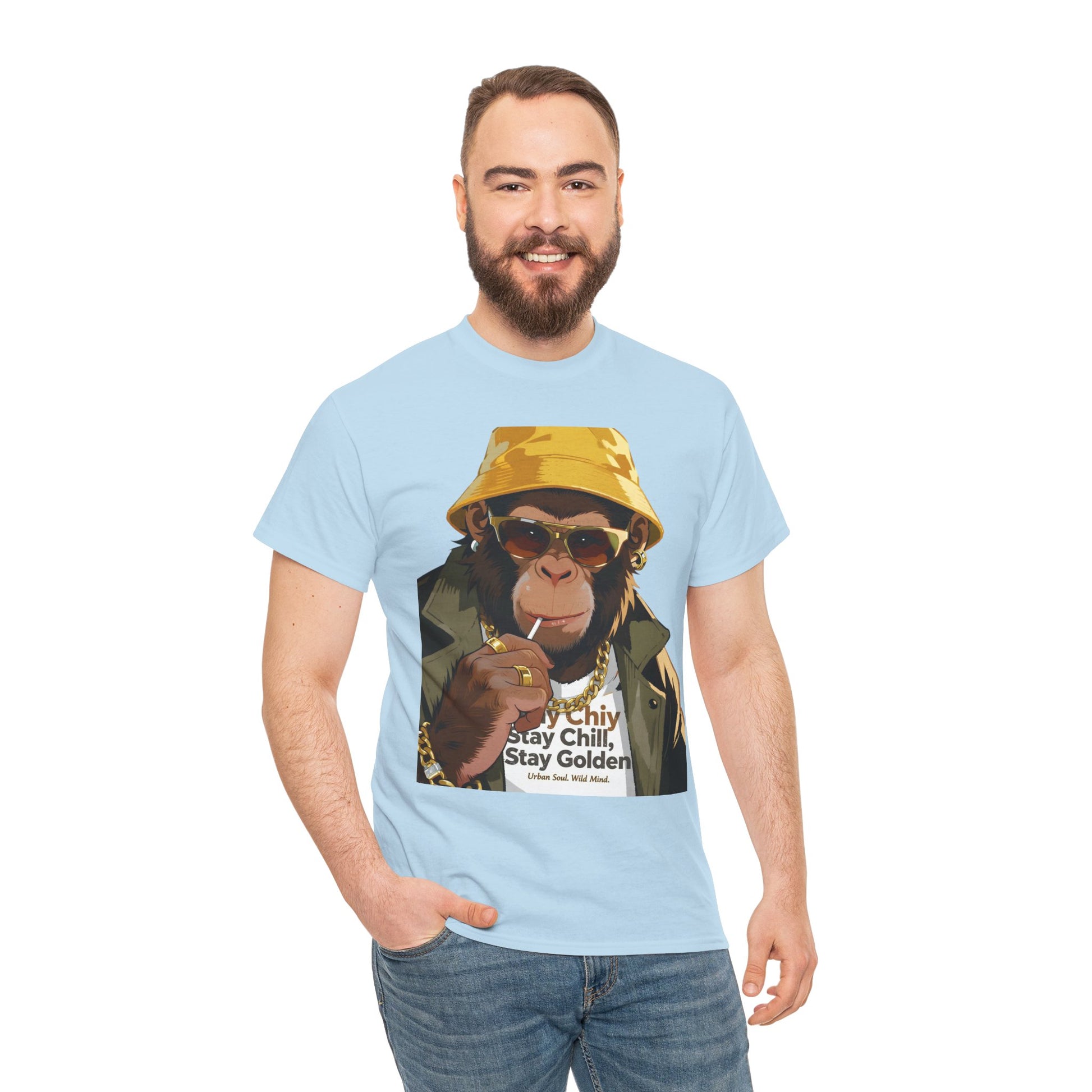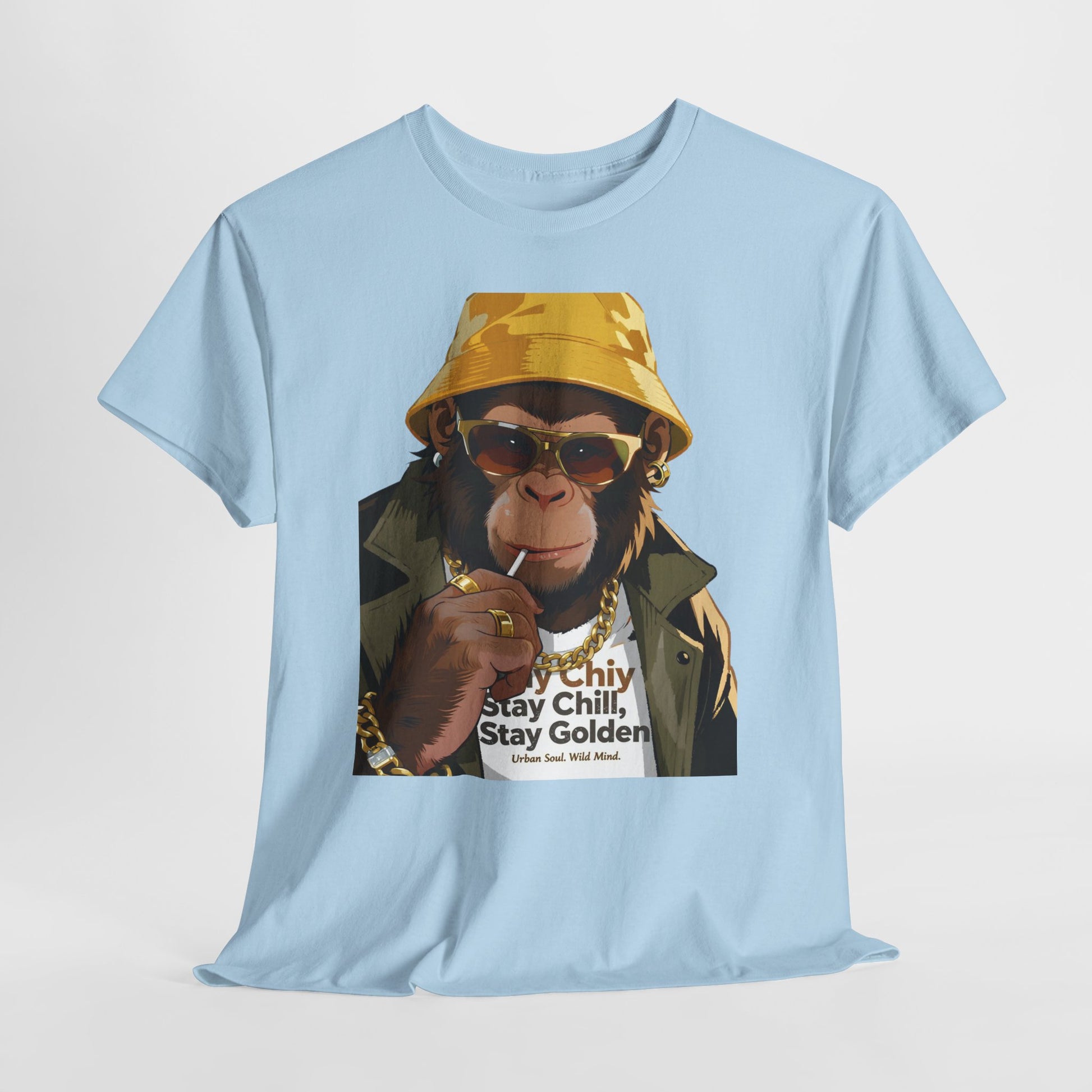 At its center sits a golden-toned chimp, bucket hat tilted just right, a playful smirk under mirrored shades. The warm ochres and soft olive hues pop gently against crisp white cotton — creating a clean, modern streetwear look that feels both relaxed and refined.