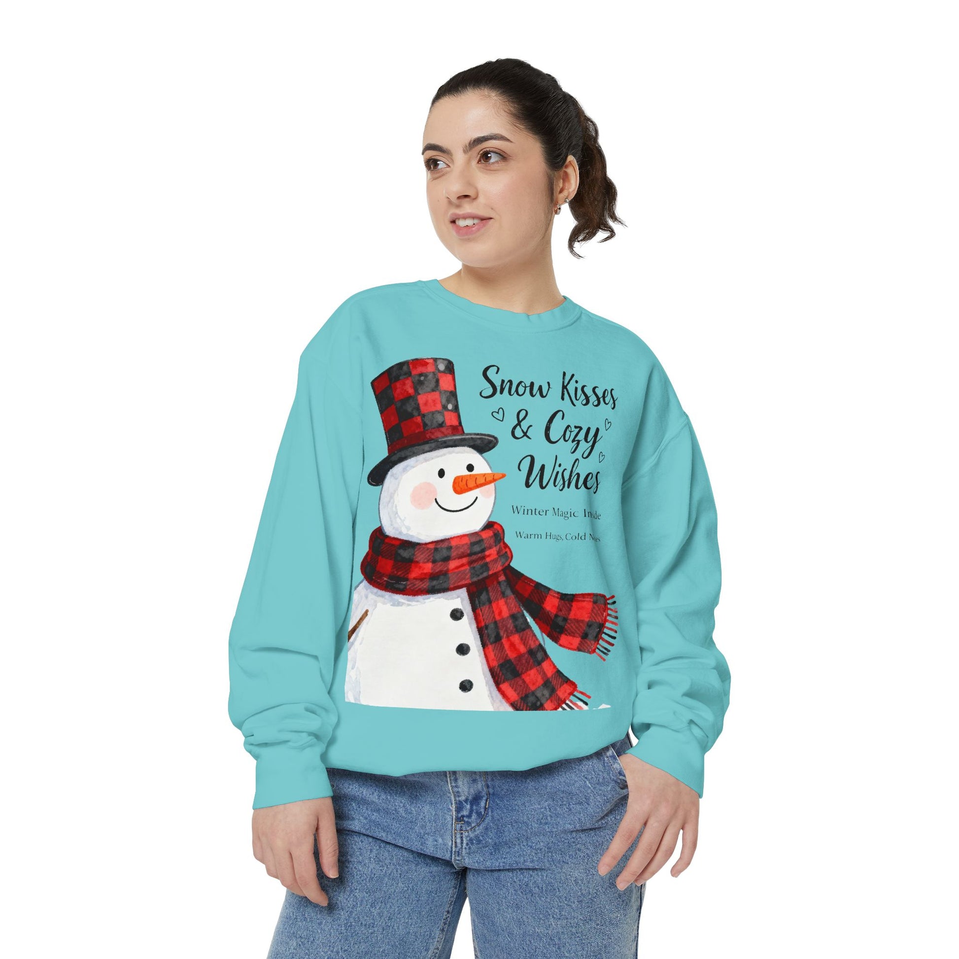 This garment-dyed sweatshirt captures that mood with its softly faded tones, friendly snowman artwork, and a touch of vintage holiday charm. The cheerful figure, dressed in a red-and-black buffalo check scarf and matching top hat, feels like an old friend from your favorite winter memories — a reminder of laughter, cocoa, and cozy nights in.